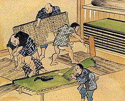 やがて平安時代の頃に寝殿造ができてくると、ただの筵だった敷物は、ワラを固めて出来た畳床に被せられ縁がついて、現在の「畳」の形に変化したと言われています。また当時は縁の文様や素材によって階級をあらわしたようです。鎌倉・室町時代頃の書院造の建物では畳が部屋全体に敷き詰められるようになり、その後も日本の建築様式の発達や完成にともなって、畳も少しずつ変化していきました。